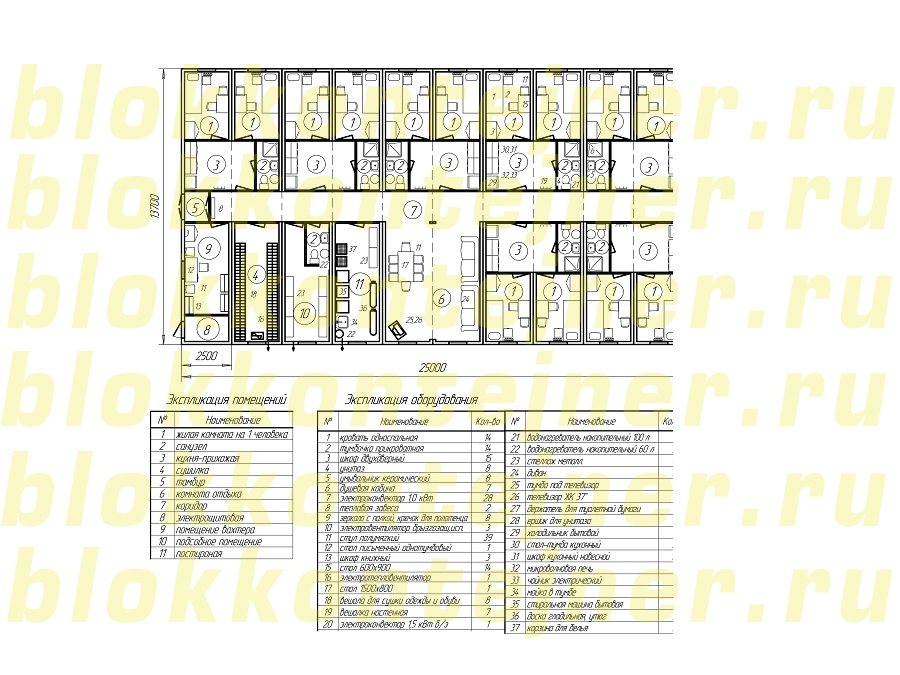 Модульное здание «Общежитие ИТР на 14 человек»   в 1-этаж, размер: (13,7 *25,0*3,0м) состоит из 20 единиц БК размер 6,0*2,4*2,5м: